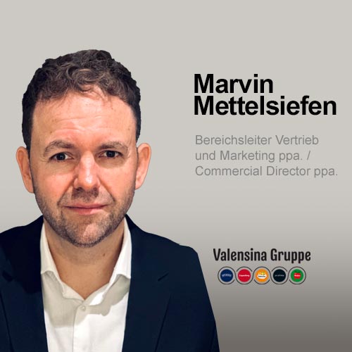 Marvin Mettelsiefen hat in Köln studiert, im Nachgang verschiedene vertriebliche Positionen u.a. bei Lidl und Intersnack ausgeübt und ist nun seit Anfang 2017 bei der Valensina Gruppe tätig. Er verantwortet den Bereich Vertrieb und Marketing als Commercial Director ppa..